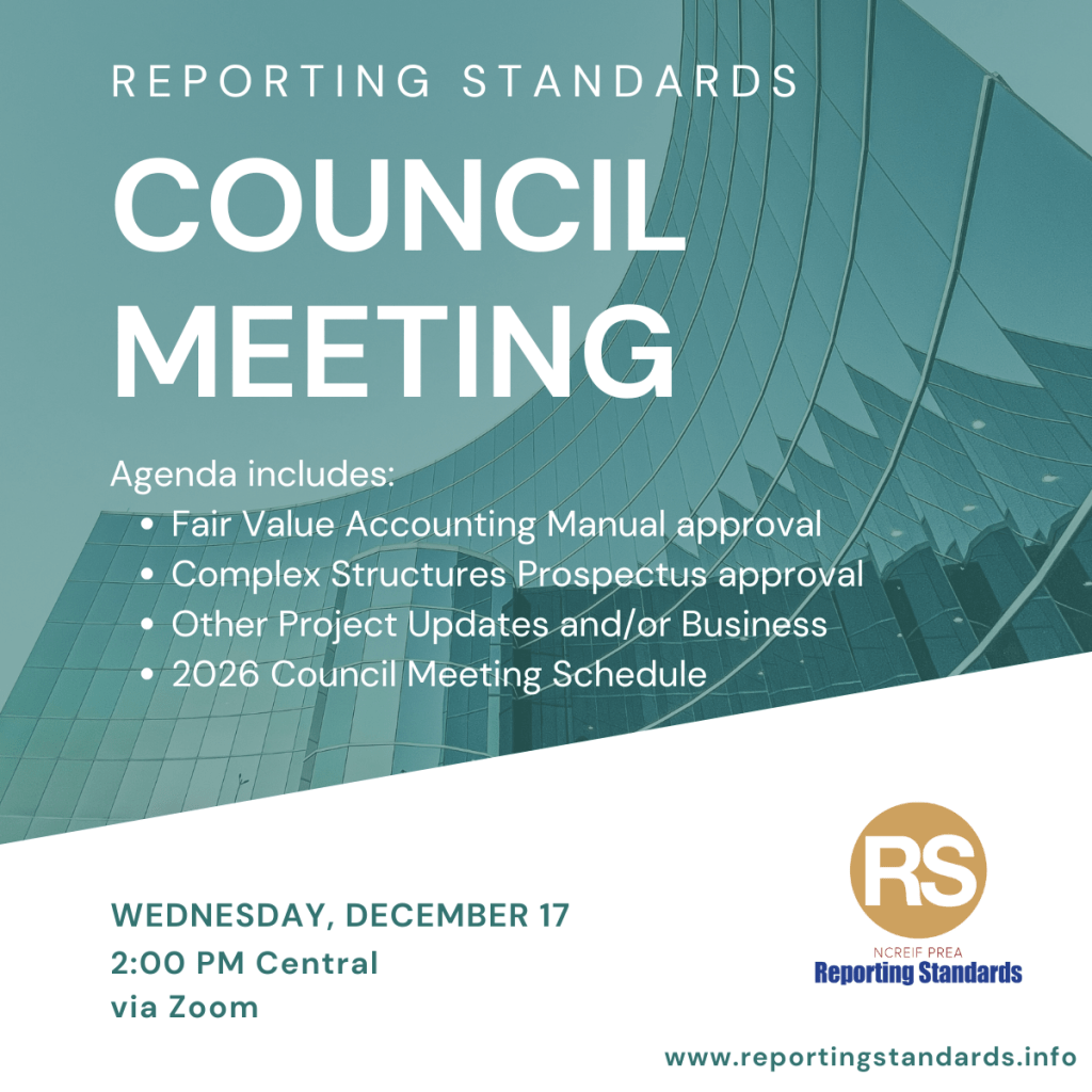 The Reporting Standards will be meeting at the NCREIF Spring Conference 2026 in Scottsdale, AZ. NCREIF members are welcome to register and attend.